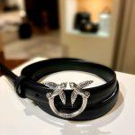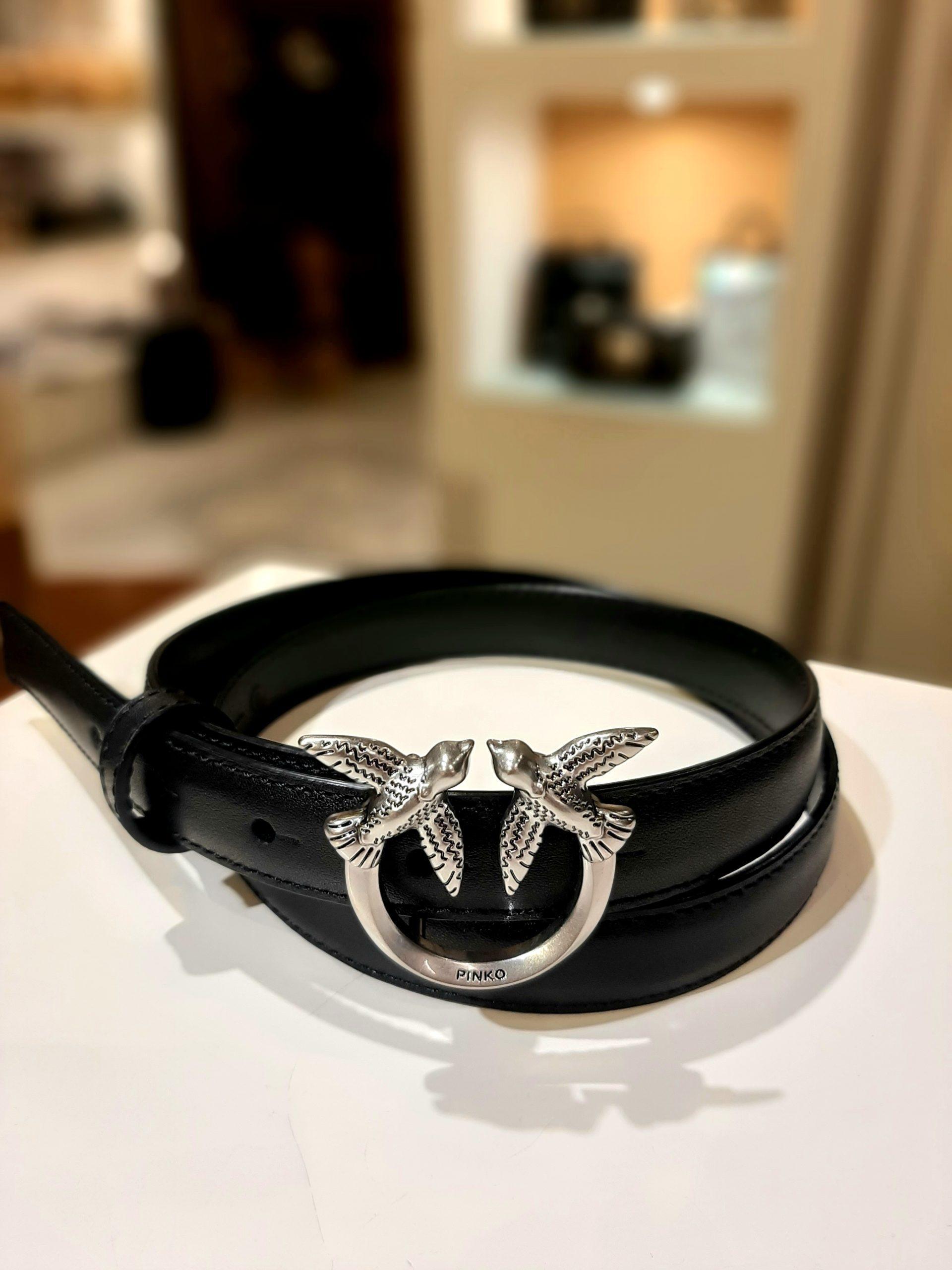 Cintura sottile in morbida pelle mano seta con fibbia Love Birds Diamond Cut in metallo.
