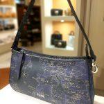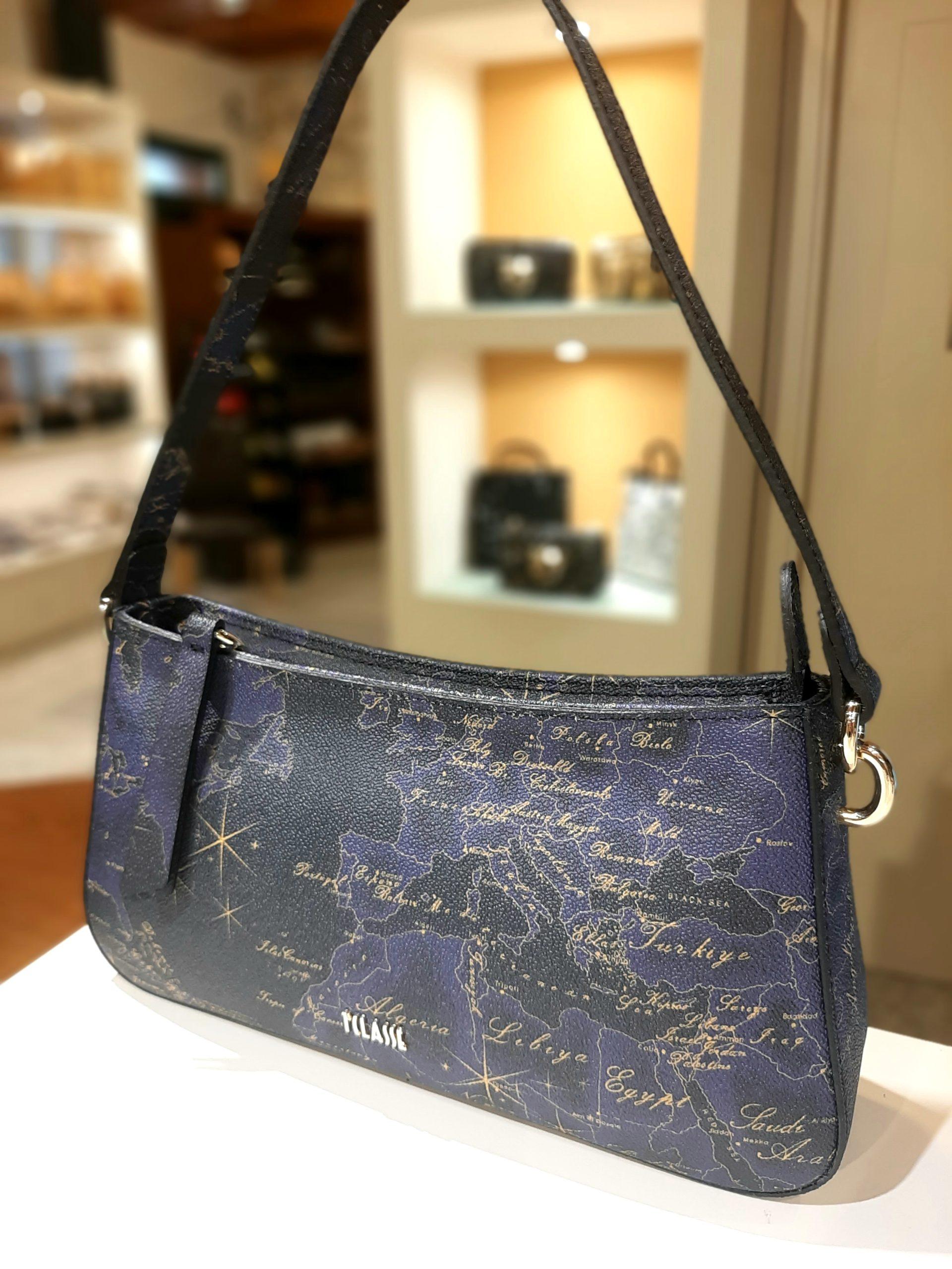 Questa borsa sottospalla di Prima Classe è realizzata in materiale saffiano, caratterizzata dalla stampa GEO in colore blu scuro. All’interno presente anche la tracolla lunga per una portabilità a tracolla.