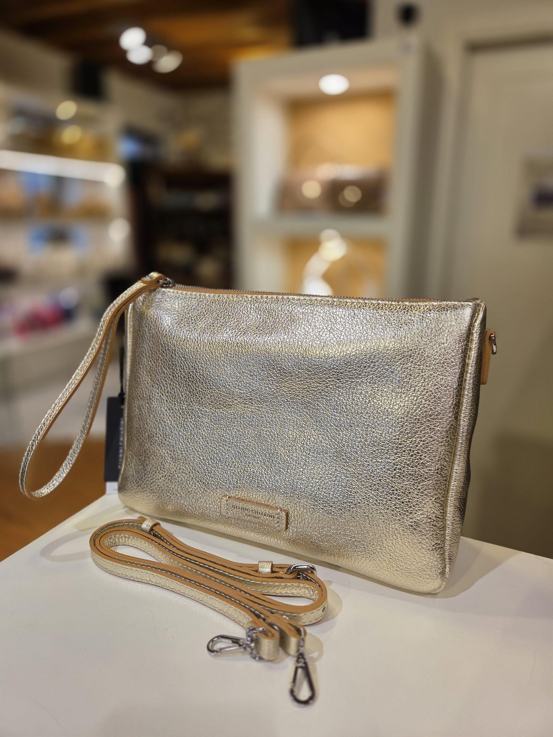 La borsa Nora Pouch di Gianni Chiarini Firenze è realizzata in pregiata pelle martellata. È caratterizzata da un elegante cinturino in pelle per portarla al polso e da una tracolla in pelle regolabile e removibile. La chiusura è pratica e sicura con zip.