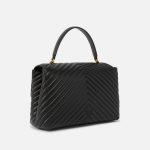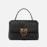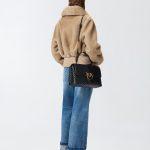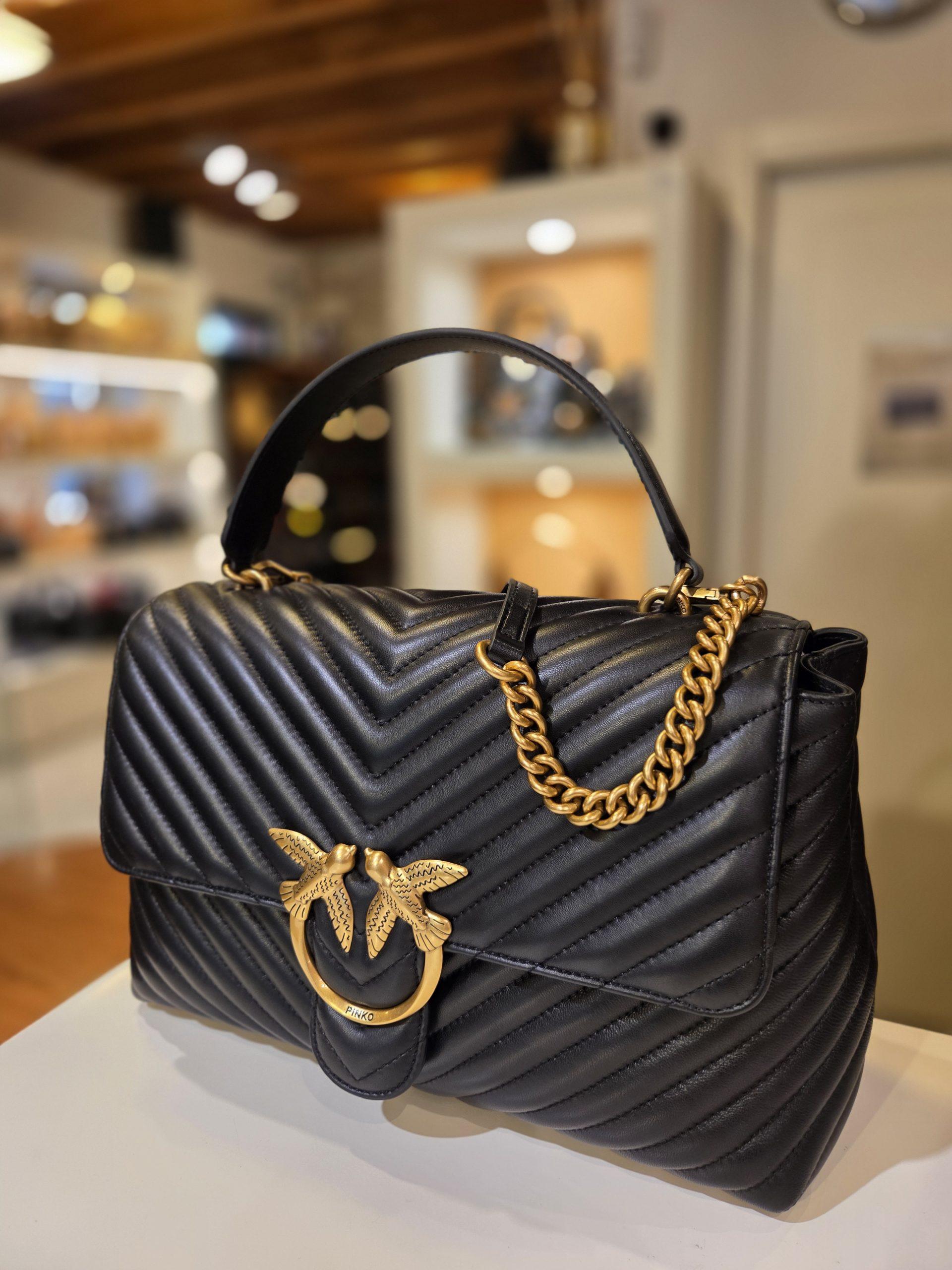 Big Love Bag Puff in nappa trapuntata con motivo chevron. La chiusura è completata dall’iconica fibbia in metallo Love Birds Diamond Cut. L’interno è foderato in microfibra scamosciata e comprende tramezza chiusa con zip e tasca a parete. La tracolla combina la classica catena metallica rotonda al pratico spallaccio regolabile in nappa.