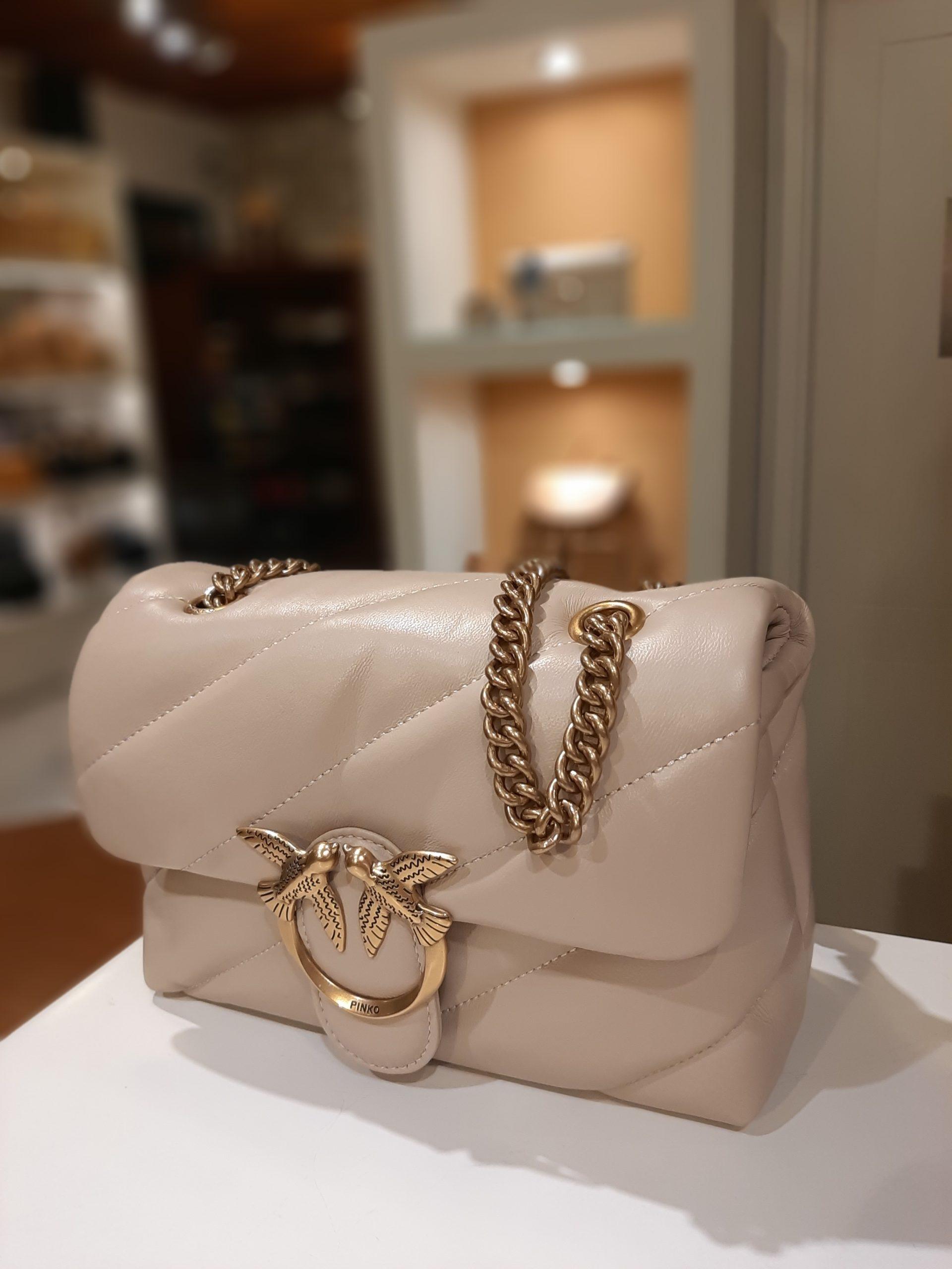 Mini Love Bag Puff in morbida nappa con maxi trapuntatura obliqua. La chiusura è completata dall’iconica fibbia in metallo Love Birds Diamond Cut. L’interno è foderato in microfibra scamosciata e comprende tramezza chiusa con zip e tasca a parete. La tracolla combina la classica catena metallica rotonda al pratico spallaccio in nappa.