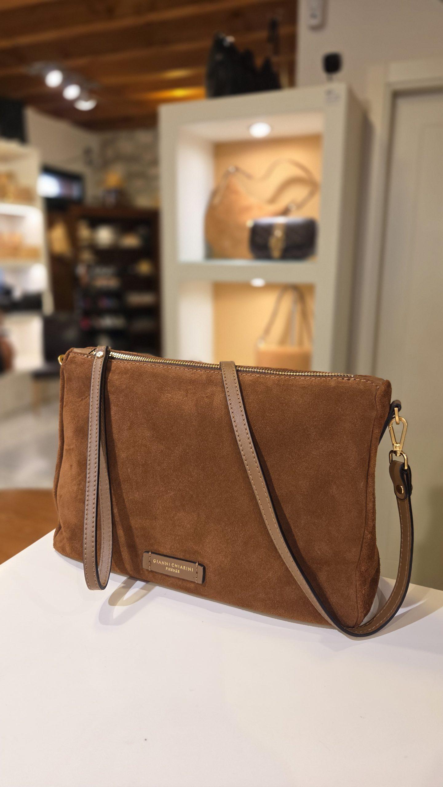 La borsa Nora Pouch by Gianni Chiarini Firenze è realizzata in morbida pelle scamosciata. È dotata di un cinturino in pelle che permette di portarla al polso e di una tracolla regolabile, entrambi removibili. Presenta una chiusura con zip per una maggiore praticità.