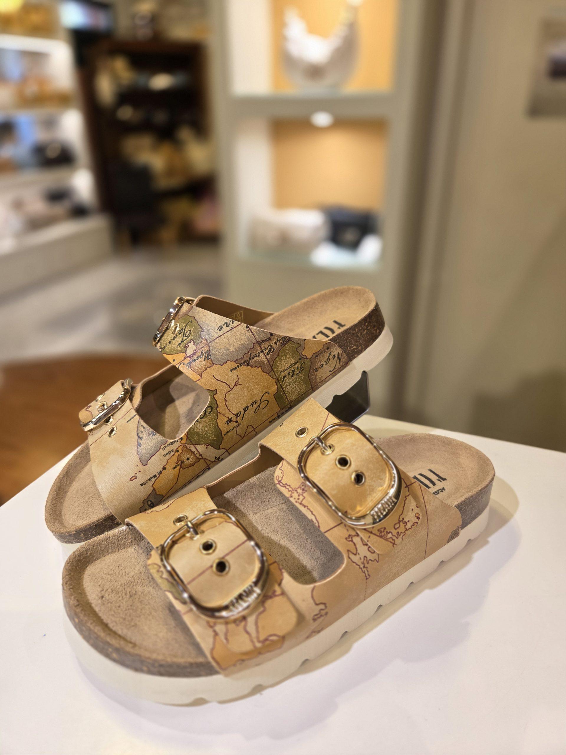 Alleati fedeli nella stagione calda, i sandali in tessuto effetto nappa sono impreziositi dall’iconica stampa Geo Classic e dalle maxi fibbie logate in oro chiaro. Facili da abbinare, sono un mix perfetto tra stile e praticità grazie al sottopiede comfort.