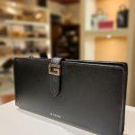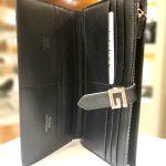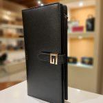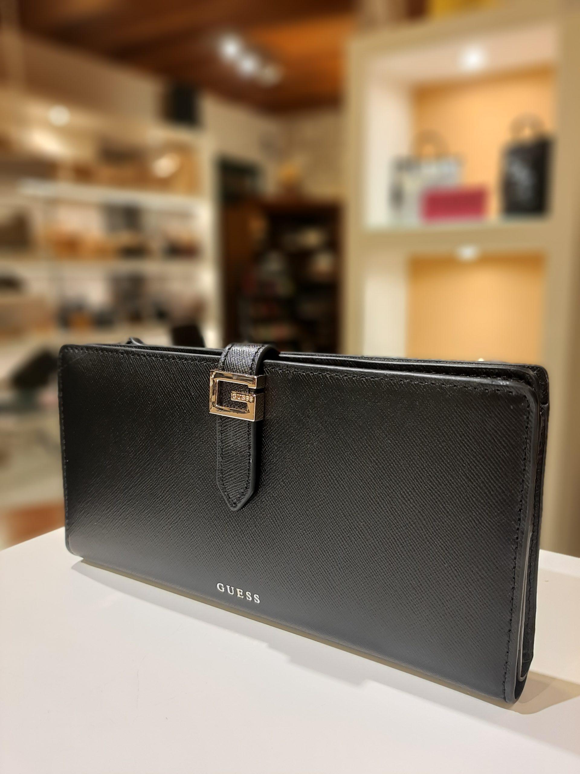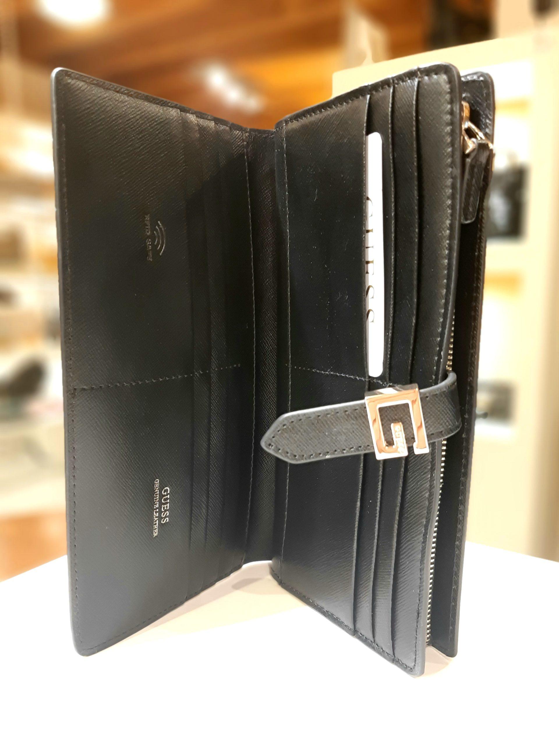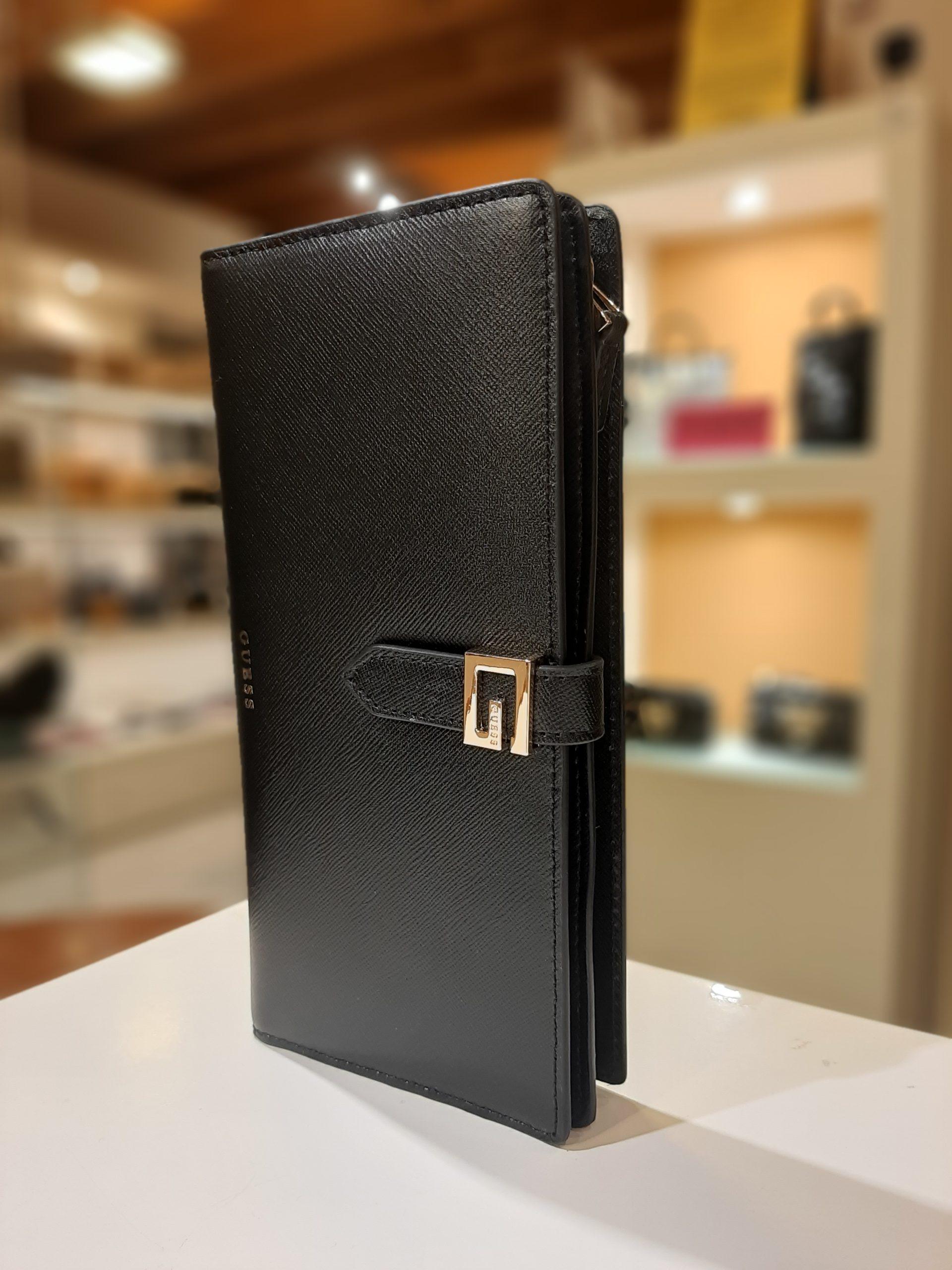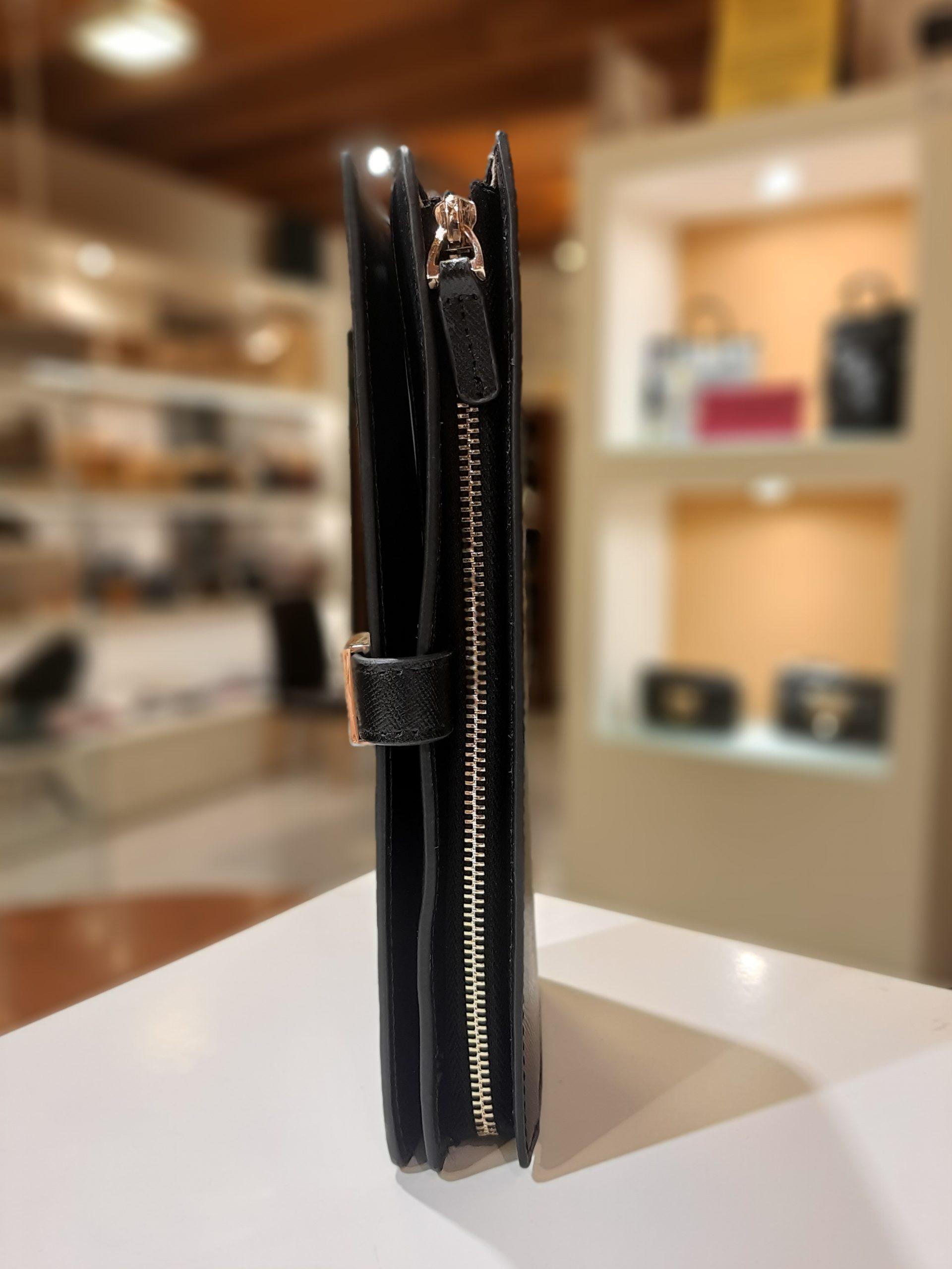Portafoglio in pelle con dettagli della metalleria in colore oro pallido. Scomparto monete e/o banconote con chiusura a bottoni , mentre la sezione con gli scomparti per tessere e carte di credito prevede una chiusura con bottoncino con dettaglio “G” caratteristica del logo. Lavorazione pellame in saffiano