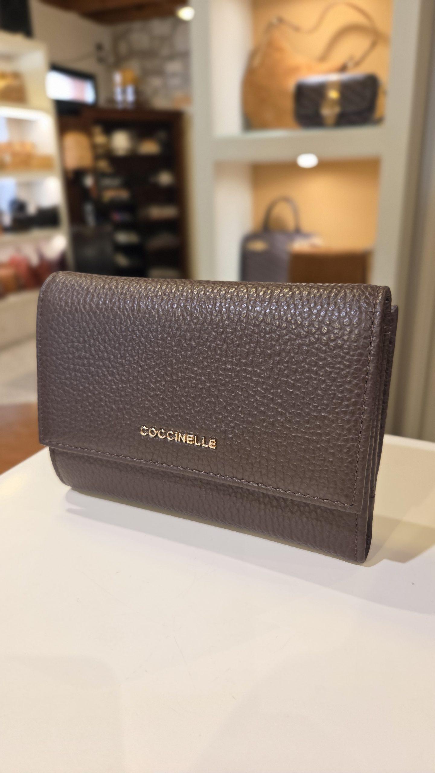 Questo portafoglio con patta della linea Metallic è impreziosito dal logo Coccinelle in metallo. Il suo spazio è organizzato al meglio per riporvi il necessario con ordine e cura.