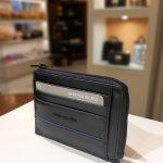 Portafoglio in formato bustina caratterizzato dallo spazio per tessere/carte di credito, monete e banconote. Realizzato in pelle e con chiusura con cerniera nello spazio per banconote e monete.